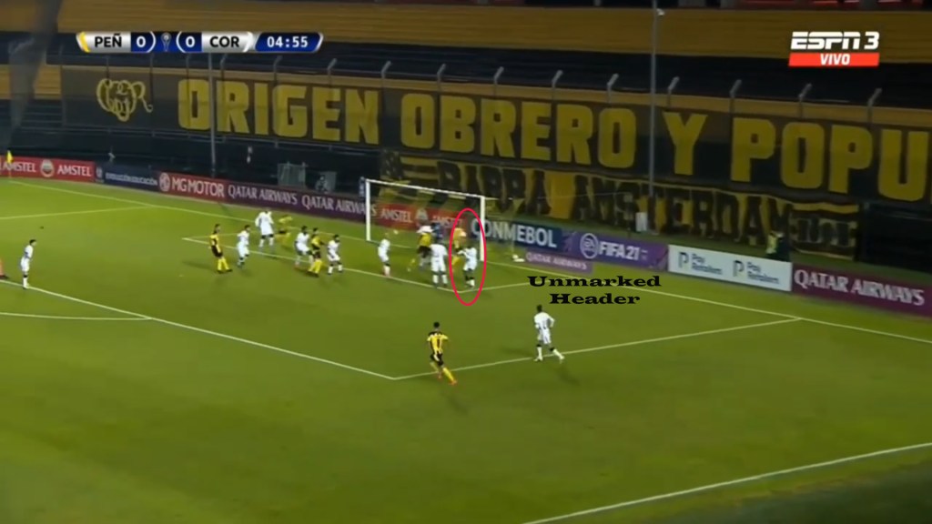 Inter, however, struck again from set-piece thanks to Dumfries. Barcelona used a hybrid marking set-up where some players were given man-marking assignments. One near the near post was zonal marking. Olmo was used as a zonal marker while Dumfries was stationed as a phase 2 player. Once the corner was in motion, the ball, which was played into the far post, was headed into the space between the zonal markers Barcelona players and the man markers. Dumfries, with an acrobatic finish, was unmarked, and Olmo failed to mark him and prevent the shot.