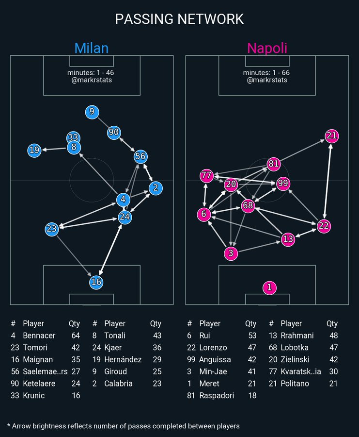 So how well did Milan press. Milan made a total of 160 pressing actions. 43% of Milan’s pressing came in the middle half of the pitch. Milan’s PPDA (Passes per defensive action) was a 8.8 against Napoli’s 10.8.