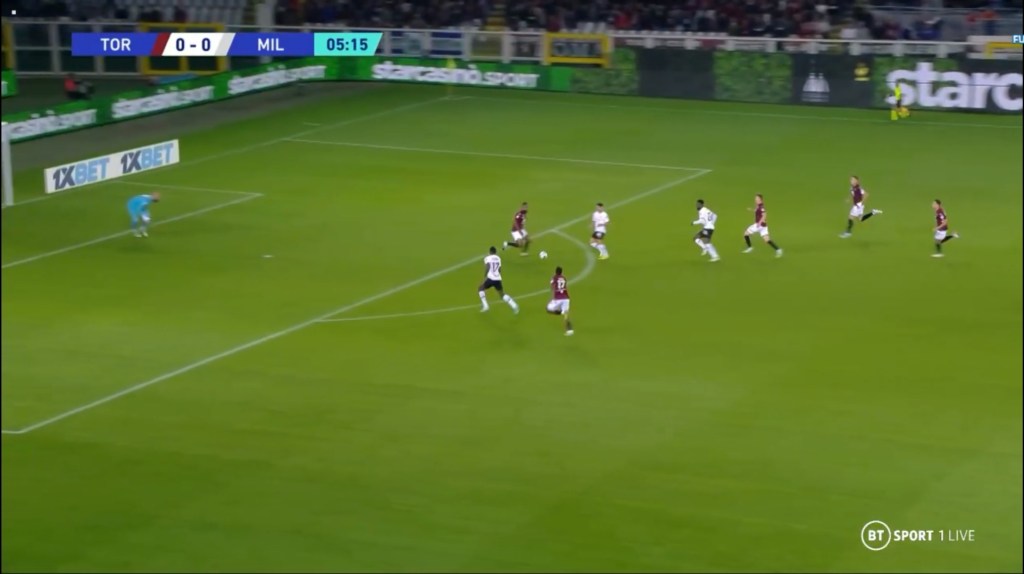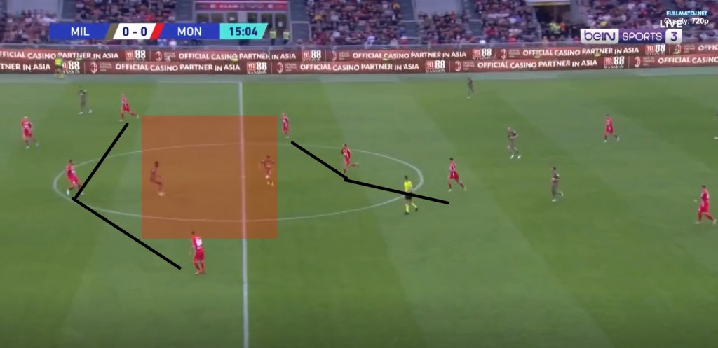 Monza, In the buildup, violated this sacred rule of Sacchi having a gap between the last line of defense and the middle line, which helped Diaz to drop in between the midfield and defense and Tatarusanu to pick him out. This was mostly done because Monza’s defenders are not the greatest in terms of recovery pace and we can see how explosive Rebic and Origi can be.