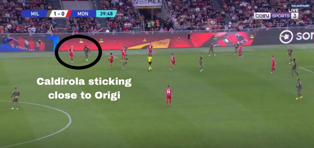 Once Monza were down Monza had to push up in search of an equalizer. They tried to pin Milan to the touchline of whichever wing the ball was in play and the defenders unlike the last time pushed up to squeeze the gap between the lines. This time Origi used his pace to beat Caldirola and pick out Brahim who occupied the space between the CB and LCB in Monza’s 3-4-2-1