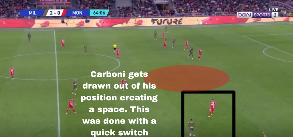 One of the biggest risks of playing a 3 at the back is that if not structured properly the formation’s biggest strength (defensive cover) can be your biggest weakness. Center-backs are not always the most agile and pitting them against wingers can be a real test of their 1v1 ability. So when Milan switched it from the left wing to the right wing, it put Messias on a 1v1 against Carboni. While Messias got the better of Carboni it meant that there was a huge gap in the half spaces between the LCB and the CB which Origi occupied before he unleashed his shot.