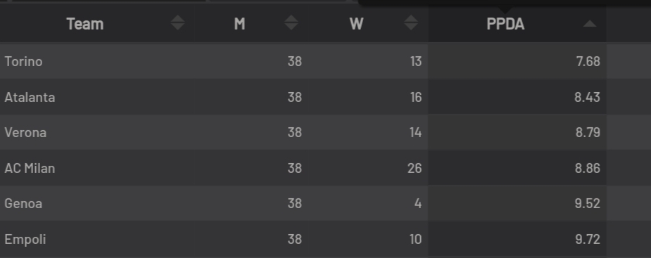 While Milan identify as a team that like to press their opponents, the team that have the most intense press in the 21/22 season was Torino as per website Understat. Using PPDA as a metric Torino allowed least amount of passes for their opponents, before a defensive action. Juric for that purpouse, deserves a lot of credit.