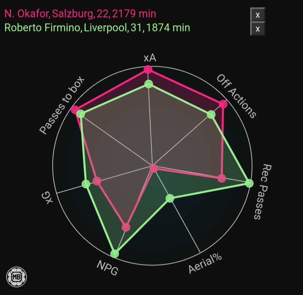 Okafor like Firmino isn’t also the greatest in the air but is good with his feet on the ground and can use his off the ball runs and make space. As we can see in the spider graph produced by @DataMB_ Okafor and Firmino have very similar style of play based on their numbers. Both are not the greatest headers of the ball, have similar level of expected assists and expected goals and have similar number of passes into the box.