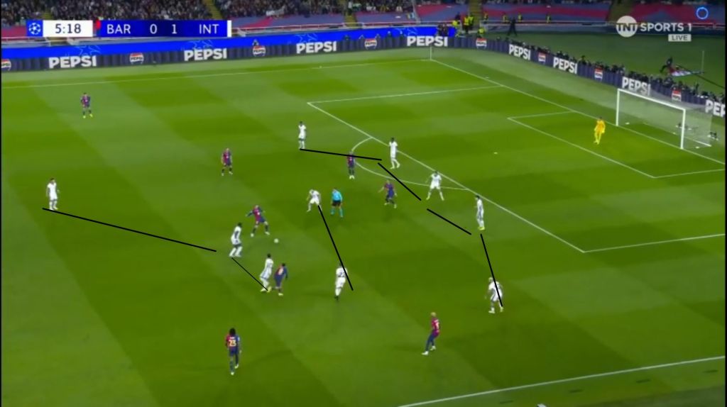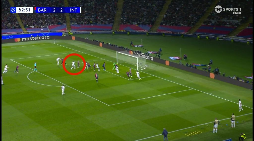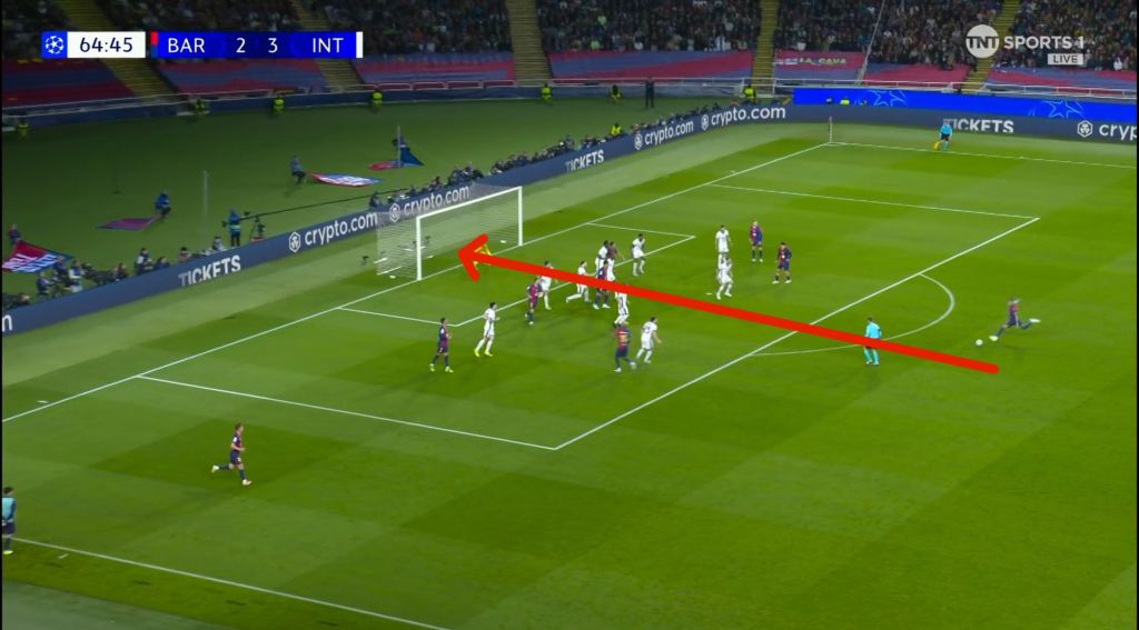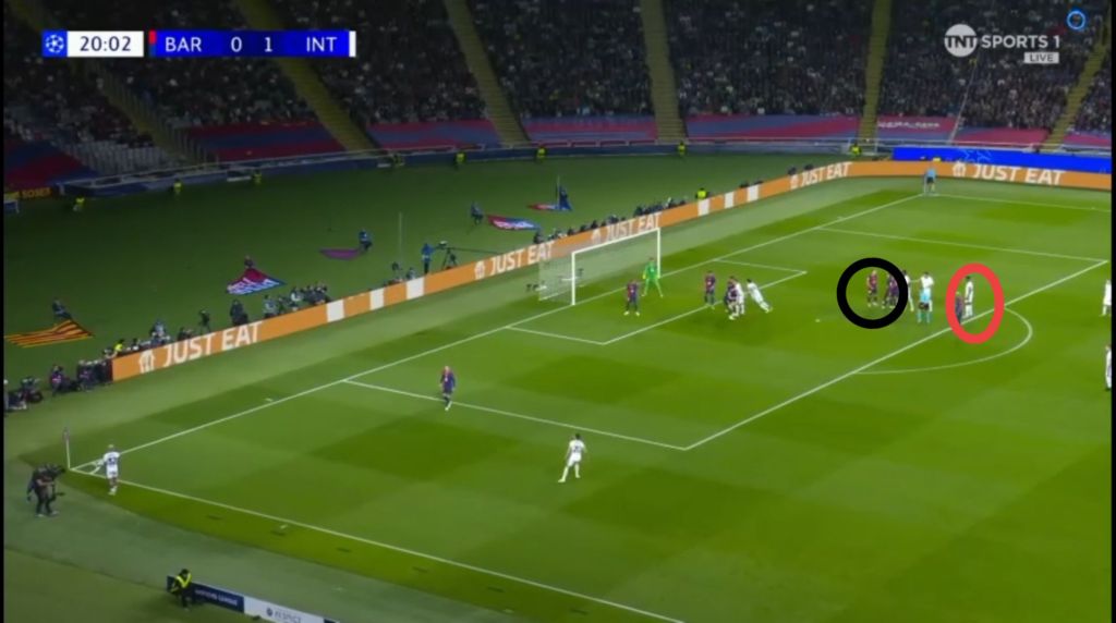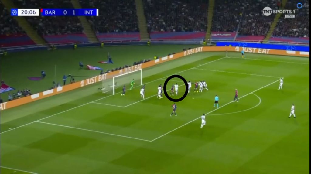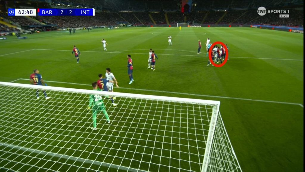 Barcelona, however, didn’t let Inter’s advantage fester with their own set piece. With Inter players pre-occupied with their markers, it cleared the  path without obstruction for Raphinha to shoot.