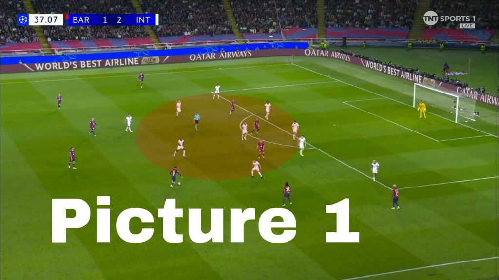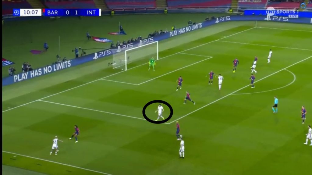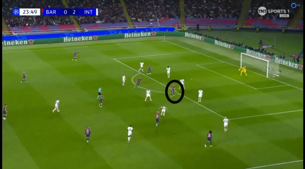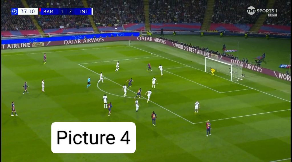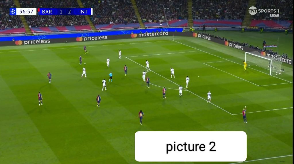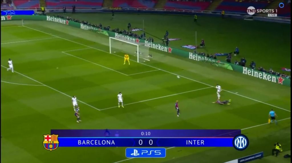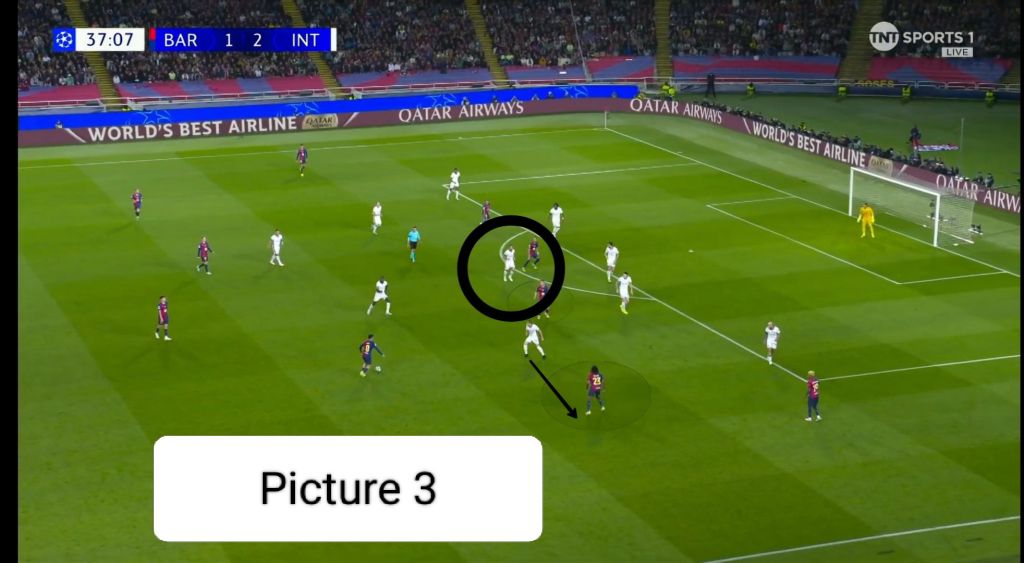 Barcelona, however, didn’t let Inter’s advantage fester with their own set piece. With Inter players pre-occupied with their markers, it cleared the  path without obstruction for Raphinha to shoot.