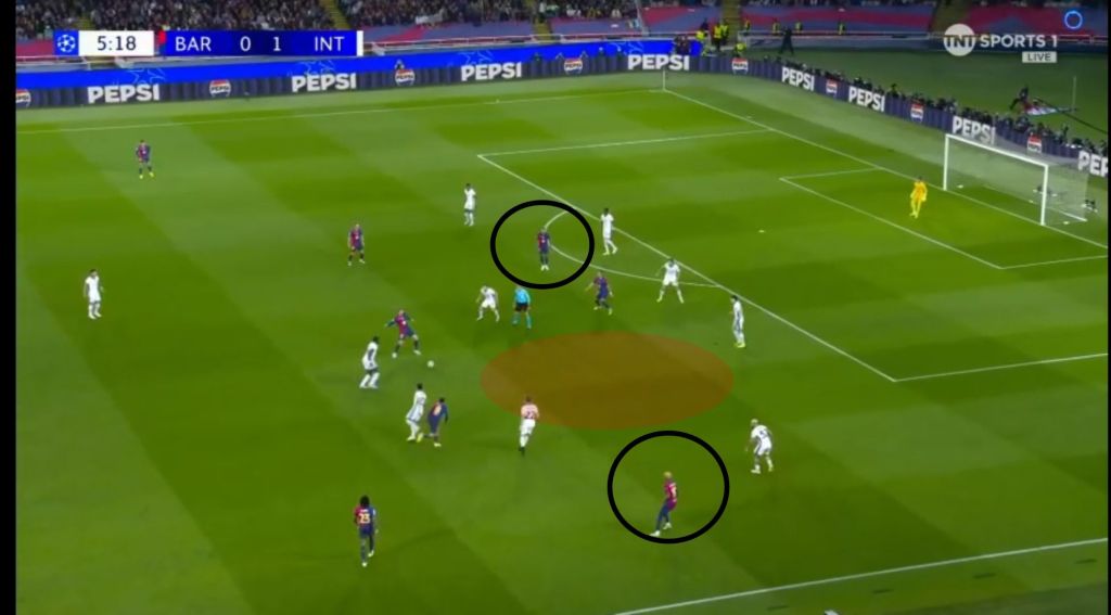 Inter conveniently settled into a 5-3-2 structure ceding possession and forcing Barcelona to break them down while using Wingbacks as a counter-attacking strategy