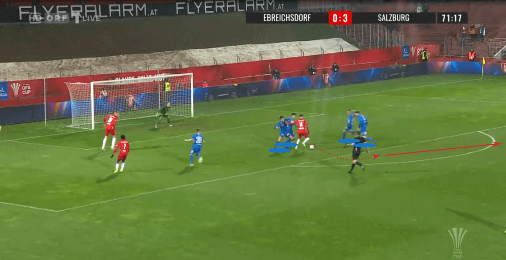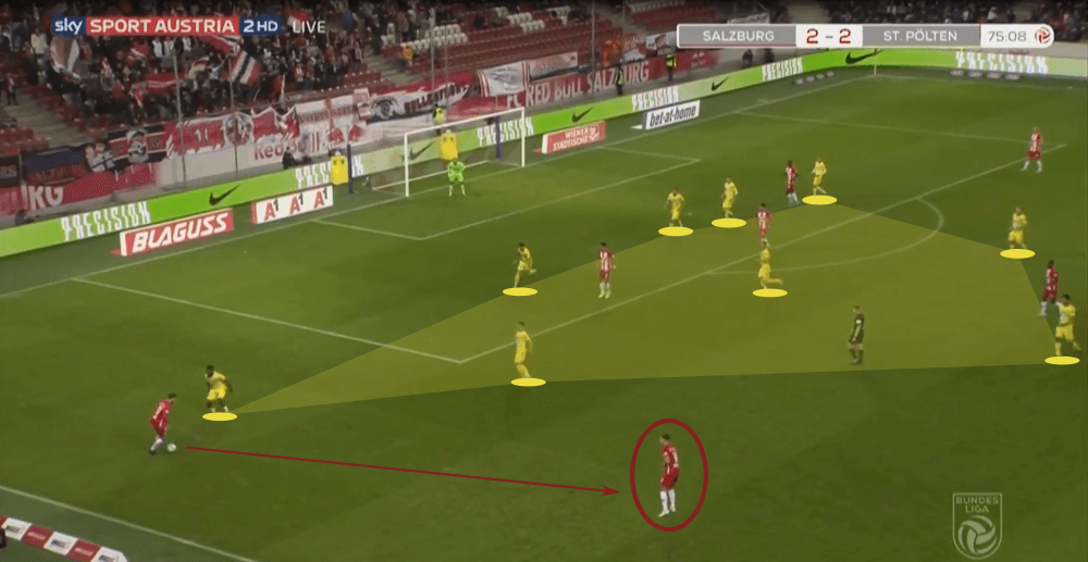 Since Salzburg use the counter press or Gegenpress as it is called in Germany, their main modus operandi is to create overloads in attack and/or defence with fast physical players. In such a system it is the utmost need for a creative intelligent passer to be present so as to catch defenders who are out of position as well as advance a passing wave. In Salzburg this role is fulfilled by Dominik.