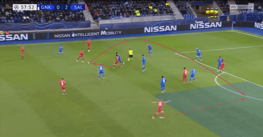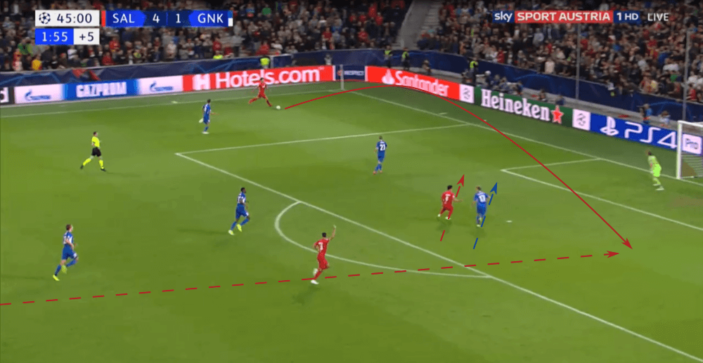 In this particular goal Dominik scored in the UEFA group stage, at a particular Szoboszlai is smart enough to not sprint at top speed and waste his energy. However he makes sure that he is fast enough to match the player with the ball in the wide position. As Minamino is positioned to recieve a cross from the wide player it distracts the Genk defenders and draws them away. Taking advantage of this Szoboszlai sprints at top speed into the box and meets the cross with a volley to score a goal. This is a very special ability the boy posessess.