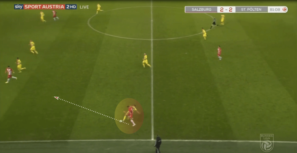 In this particular game shown in the image below, Szoboszlai has the option of passing to his left towards Andreas Ulmer, but he spots the run of Rasmussen on the opposite flank and makes a cross field diagonal cross to reach him