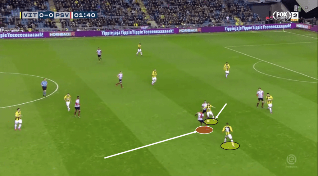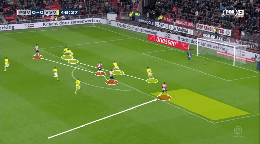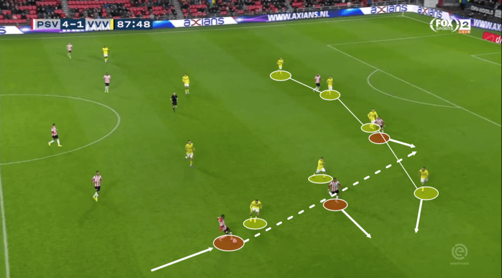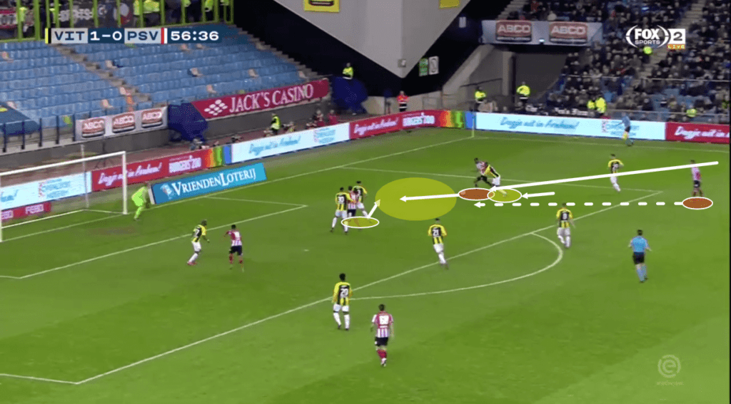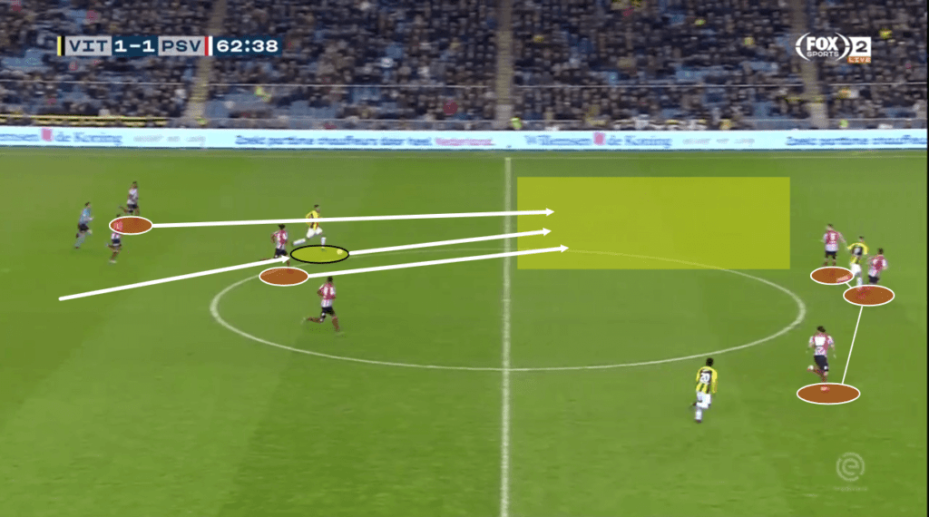 However with a advanced position and agressive pressing he leaves a lot of space behind him which makes PSV susceptible to quick counter attacks. The solutions for these are of 2 types which involves Dumfries tracking back and covering the space or the Right centre back adjusting his position to prevent quick counter by closing down the space.