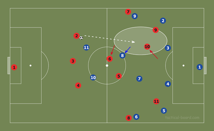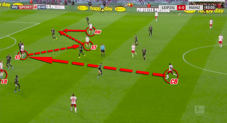 In this example below we can see how high Upamecano is up the pitch with the ball against Mainsz 05 (This move led to a goal). The basic idea of Gegenpress is to press high as possible and win the ball deep in the opponents’ third. This requires the last line of defenders to press very high up the pitch as even almost higher beyond the half way of the field. This makes the team susceptible to quick counter attacks and hence defenders are forced to track back.