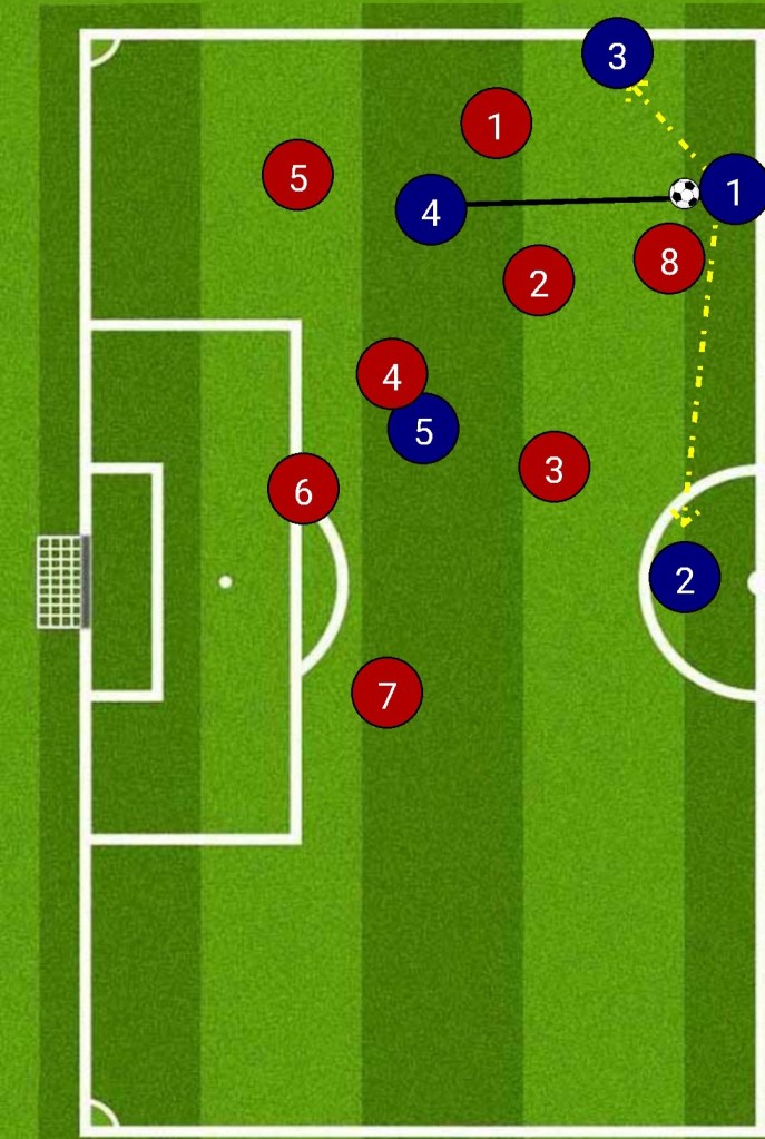 In this image below, you can see how player 1 which is milenkovic has the safe option of passing to player no.2 or player no.3 but chooses to advance play to player no.4 and split the lines with his pass.