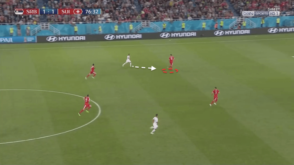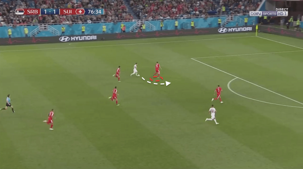 An example of his technique can be seen in the image below. Shaqiri is approaching milenkovic at pace with the ball. Milenkovic positionings himself in a distance not too far not too close that he can be beaten by a quick jink.