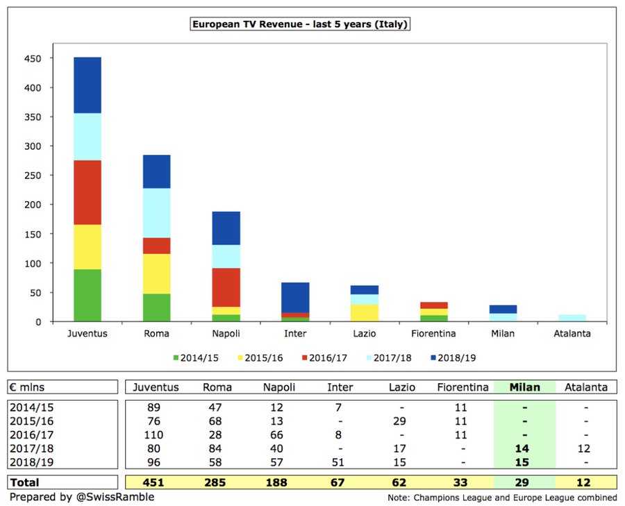 Ever since Milan got kncoked out by Atletico Madrid from the champions league in 2013, Milan have qualified for Europa League only twice. Hence Milan’s prize money from both campaigns is a meager €29 Million due to non participation. Meanwhile Juventus have earned €481 Million, Roma €285M and Napoli €188 Million. Even Inter earned €54 million from their Uefa Champions League group stage exit which in itself shows how much Milan are missing out.