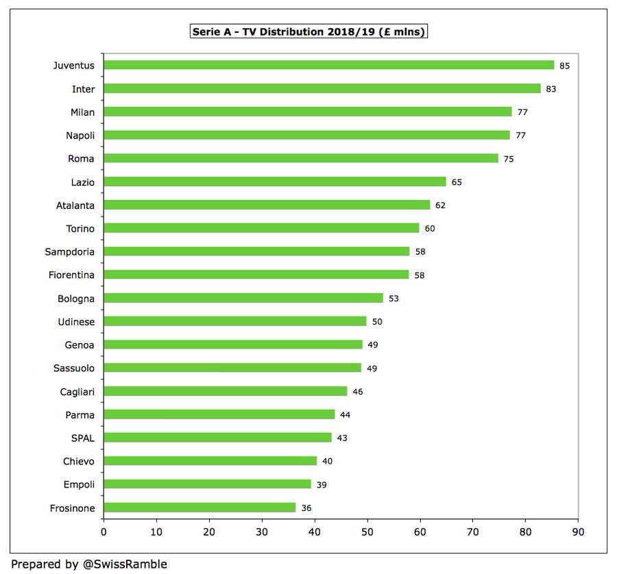 Serie A TV money is distributed as follows: 50% equal share; 30% performance (15% last season, 10% last 5 years, 5% historical); and 20% profile (number of supporters). The new 2018/19 deal increased the equal share from 40% to 50% and placed more emphasis on recent performance.