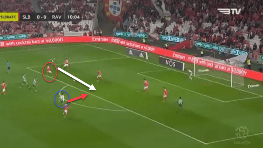 Due to his agreesive pressing nature he also tends to get side-stepped by opponents who are faster than him as seen in the image below
