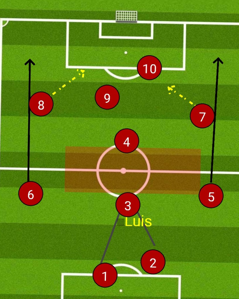 A key component to understand Luis’ style of play and positioning is understanding the system employed by Bruno Lage. He uses a modern adaptation of a 4-4-2 which sees high tempo and plays posession football. When in posession full backs push forward and wingers mover into the centre with one centre midfielder pushing football and Luis staying back. A forward drops back to create a passing option between the lines and this creates an overload in the centre.