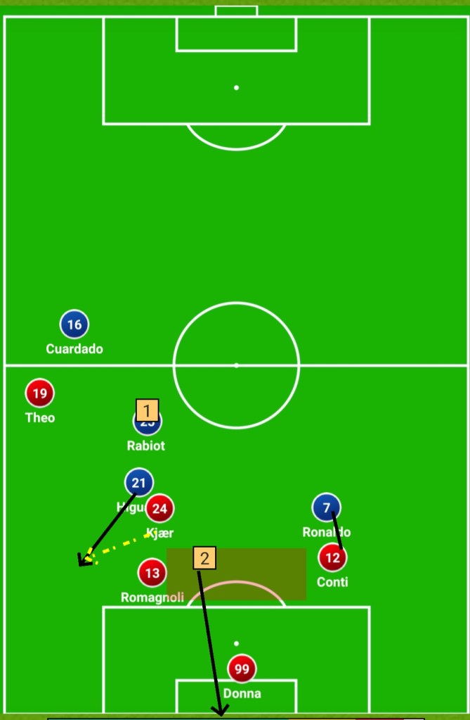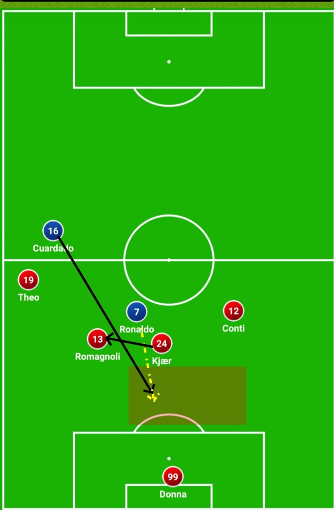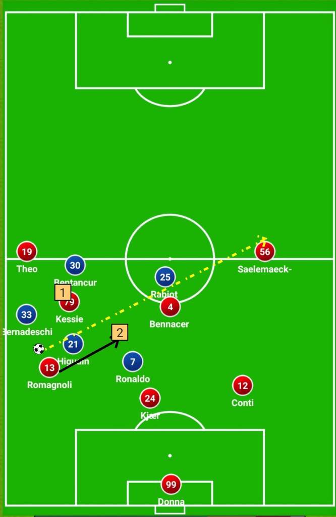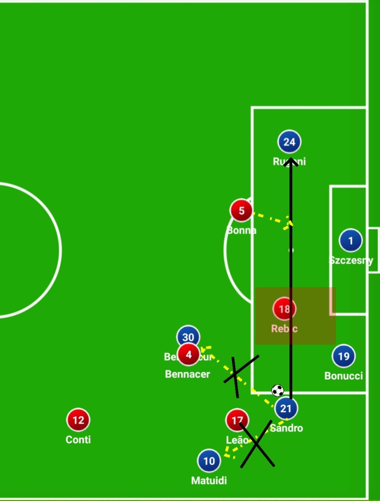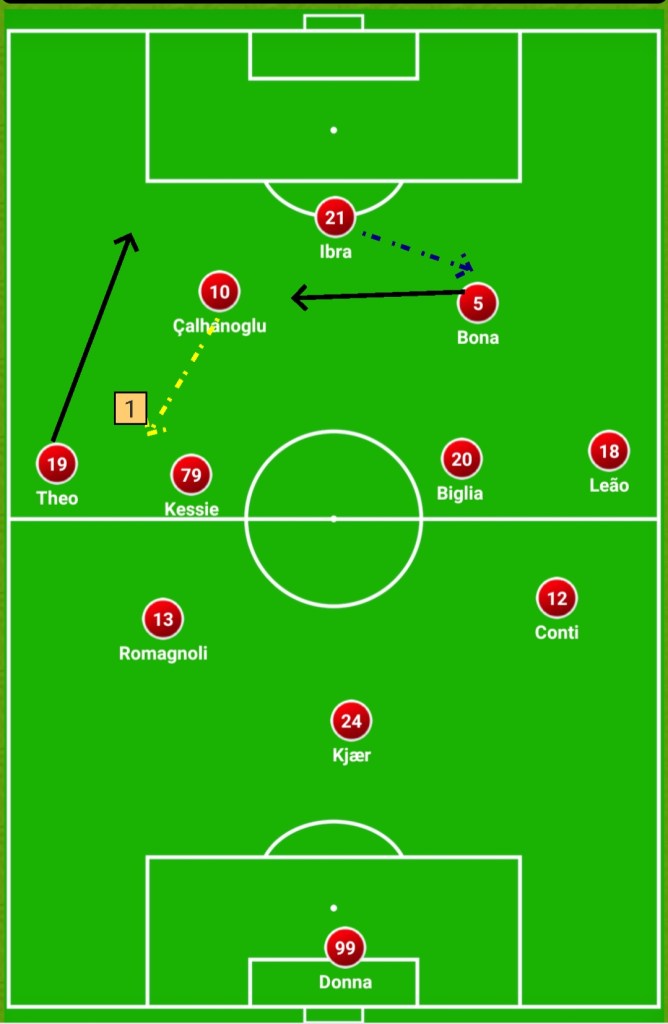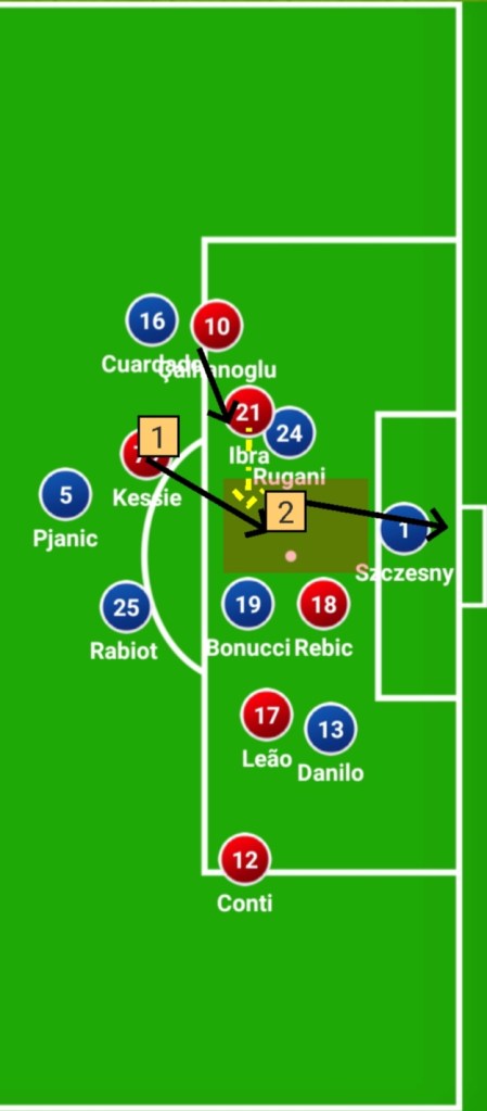 Rebic carried the ball out from defence. Ibra made runs to pull caldara out of position and held up the ball and passed to Rebic who made unmarked runs up the left flank.
