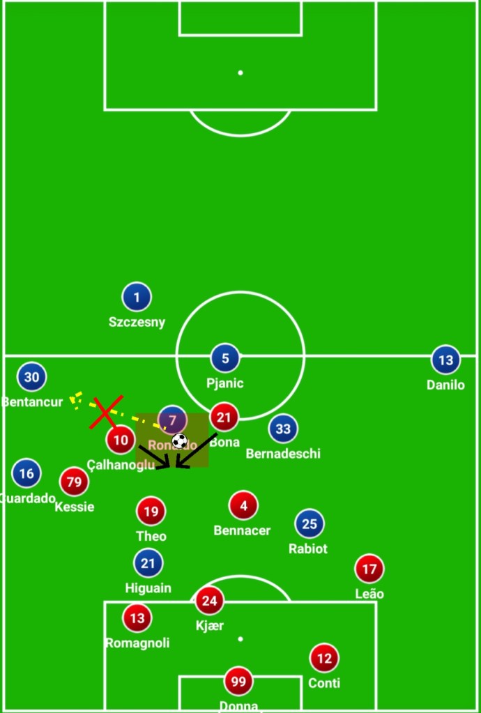 Milan too were pressing in a triangle. In the below picture they closed our zapata from a throw in who played a quick pass to caladara which was inaccurate and went to Çalhanoglu.