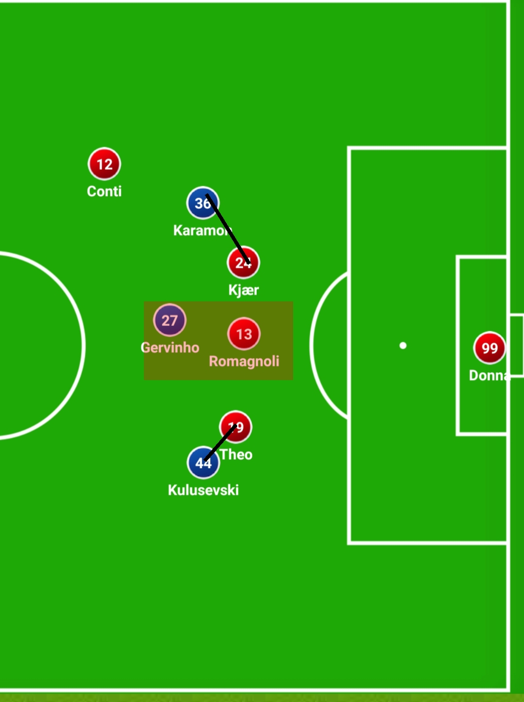 Milan negated this overloading by having a very narrow system and having enough people in the right flank. We had Saelemaekers playing a pseudo Right wing back role and Calabria tucking in as a make shift CB to deny space to Zapata to make runs. Kessie and Biglia pushed up horizontally to cover passing lanes and prevent switches of play or a square passed to Malinovisky.