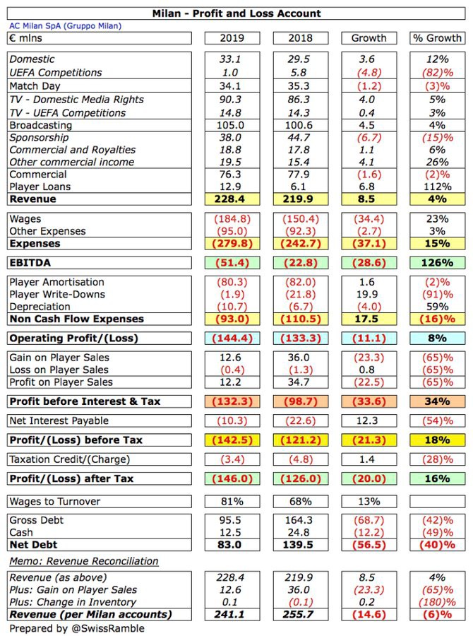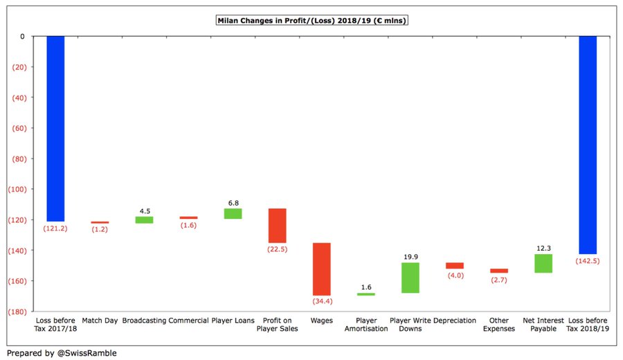 – Milan’s loss after tax widened 20M from the previous season (17-18) to €146M. The worst in Serie A.