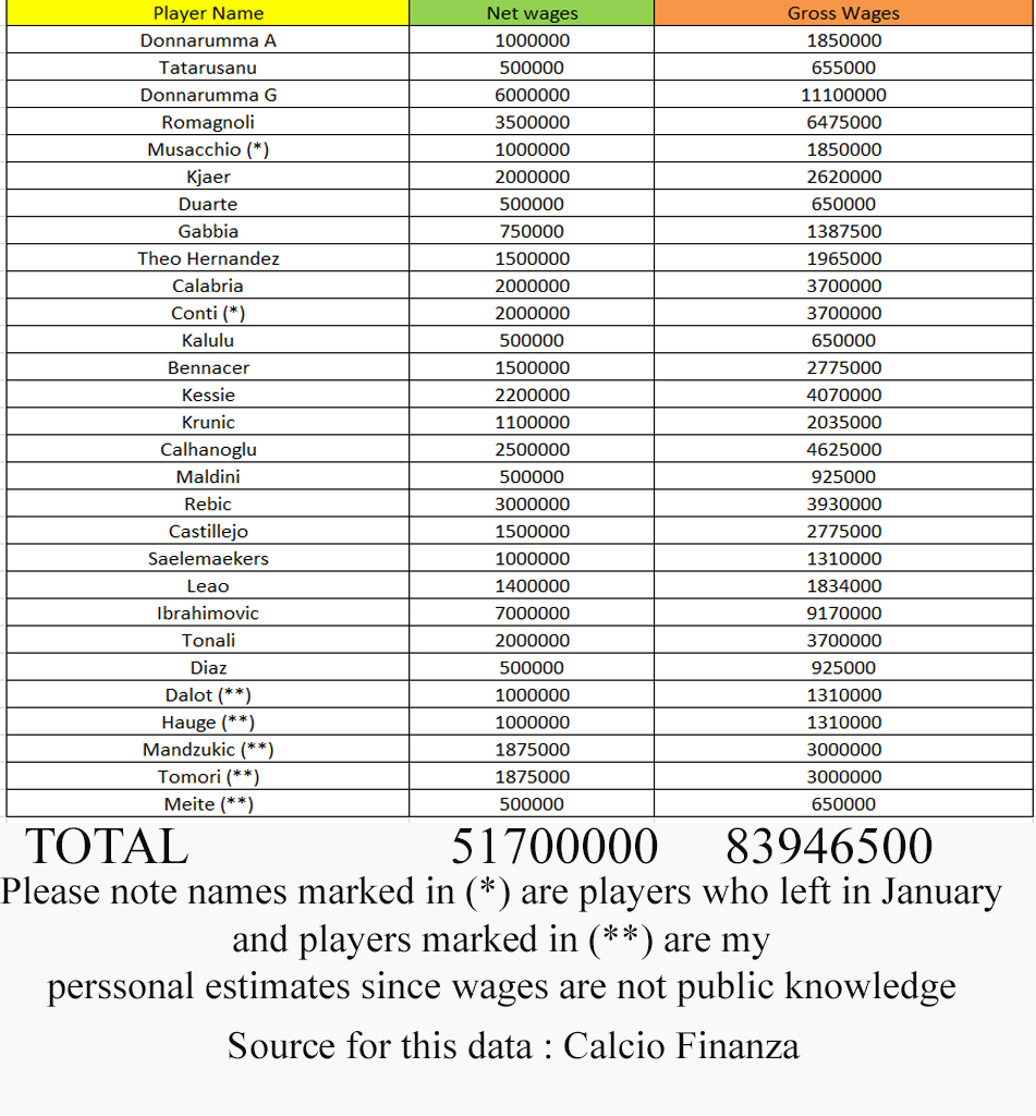 One of the problems plaguing Milan was that we Milan’s wage to turnover ratio was an undesirable number which meant that the wages were at an unhealthy high and despite high wages Milan were not achieving desired heights and therefore the exercise of trimming the wage bill started since the 2019/20 season. Bonaventura (2M net), Biglia (3M net), Suso (3.5M net), Musacchio (2M), Pepe Reina (3M net), Rodriguez (2.2M) were offloaded and players like Conti (2.2M) were loaned partially offsetting their wages. This reduced Milan’s wage bill to a total of €83.94M
