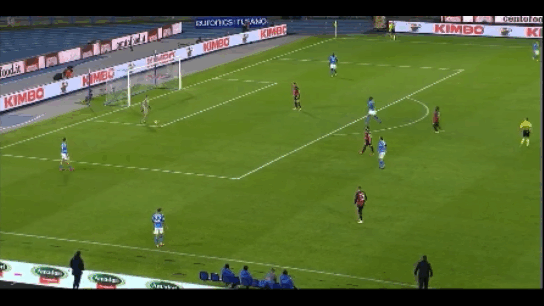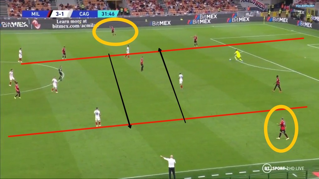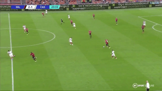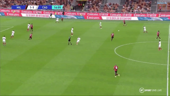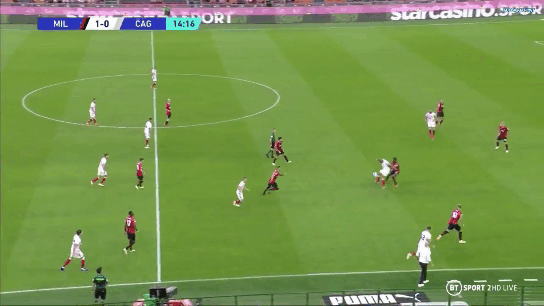 Cagliari had a 5 man midfield to stretch and to prevent Milan’s narrow press from overpowering their attack they smartly tried to switch play all game. One such chance was when Joao pedro switched from their right flank to the left to Dalbert and Milan were scrambling to cope with the switch