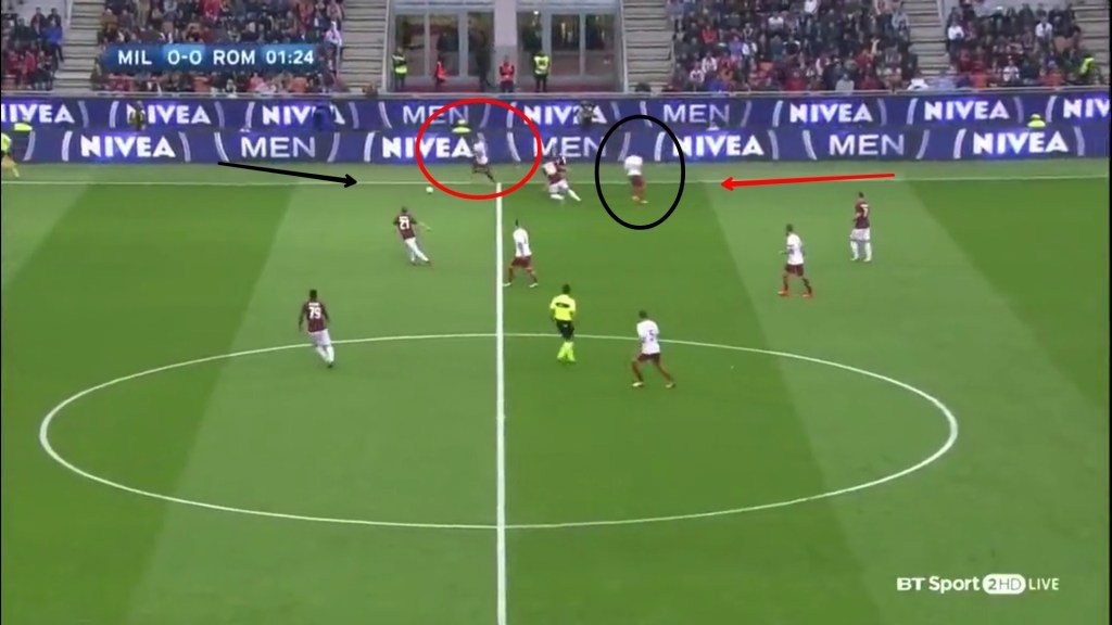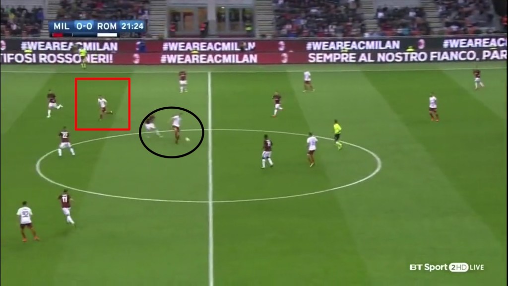 Notice how when Dzeko (in black) is holding up play, Florenzi makes runs behind the defense (in red)