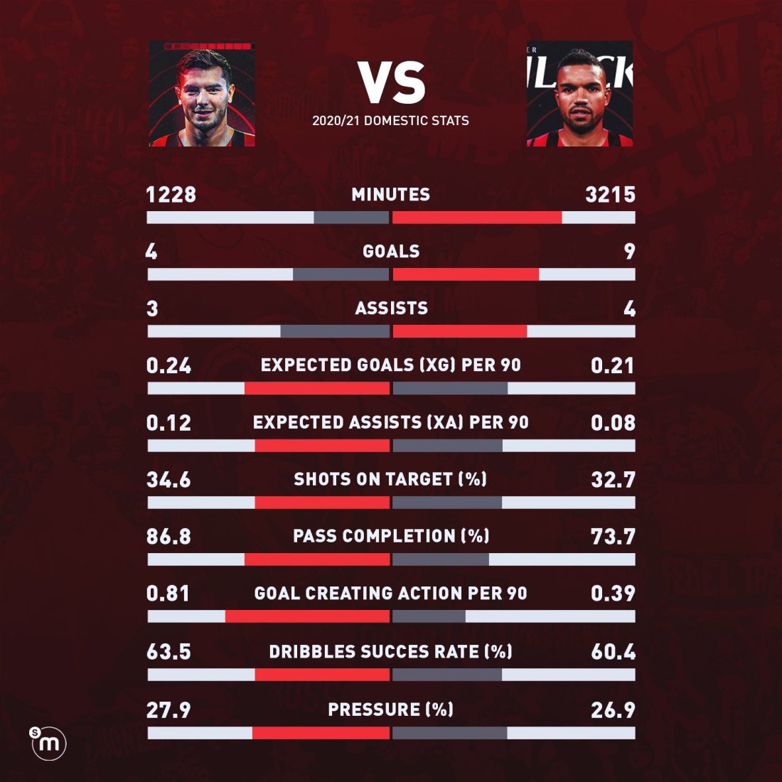 Numbers are often indicators to performances and here is a comparison between the 2 big men up front for Milan.