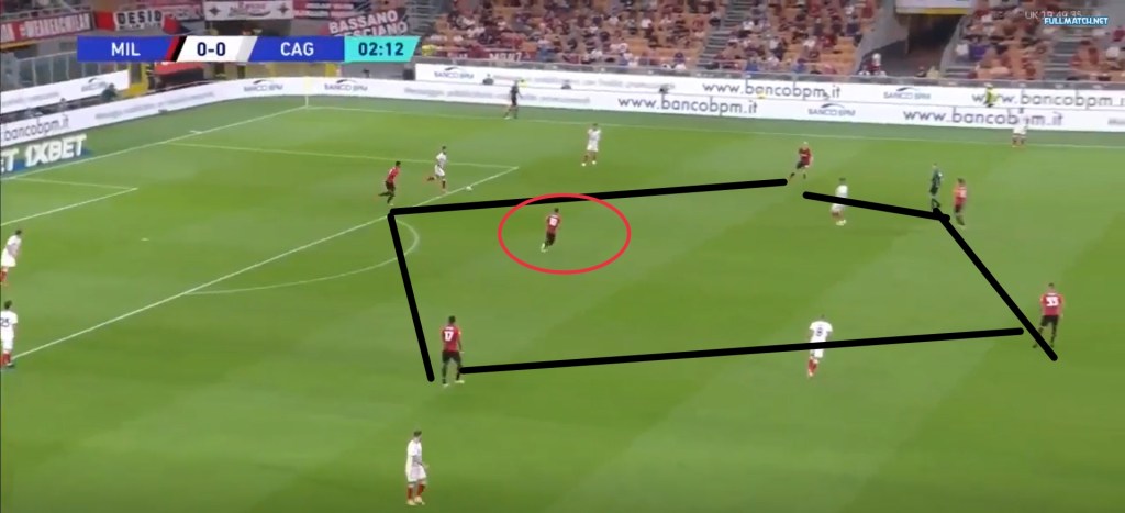 Cagliari, to gain midfield domination, had a 5 man midfield with their 3 at the back formation. They used it to form a narrow midfield block not allowing Milan to build up through their center. Milan conveniently used Theo or Calabria to build up play or advanced the play through the wings and then cut back to Kjaer or Tomori to use the center of the pitch.
