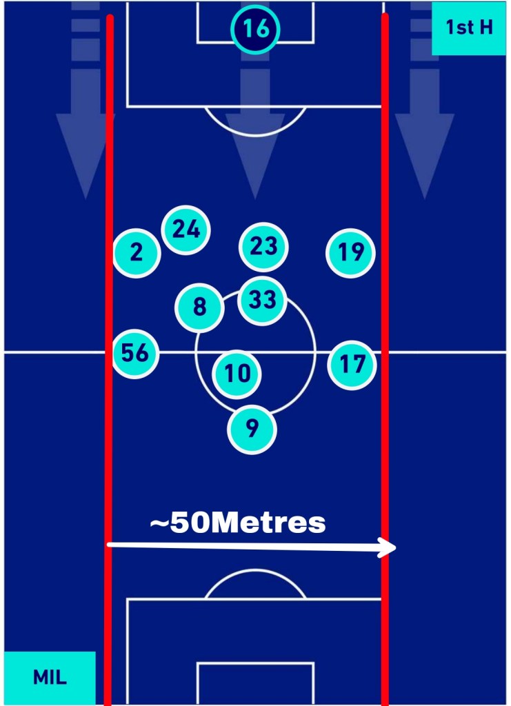 A very important aspect when trying to press the opponents is to keep a deep narrow block which is compact and with very less space between the defensive lines. Sacchi used to profess not more space than 15-20 metres. While Sacchi was an elite coach managing Elite players Milan were compact on their own accord and narrow not extending to the wide areas of the pitch as can be seen in from the post-match stats.
